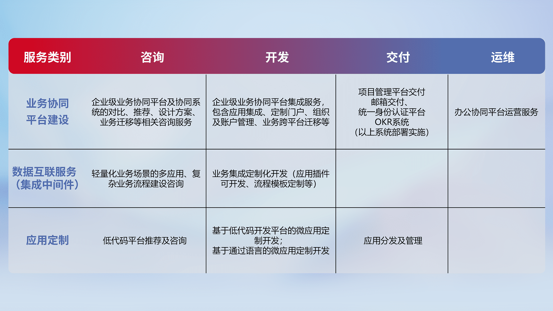 针对钉钉、、、、企微、、、、IDaas等平台级产品提供产品的规划、、、方案、、交付、、、定制化开发等服务,,,实现如统一协同办公、、、、智能客户服务、、、混合会议管理、、智能数据查询、、、、等业务场景,,,实现数字化转型。。。