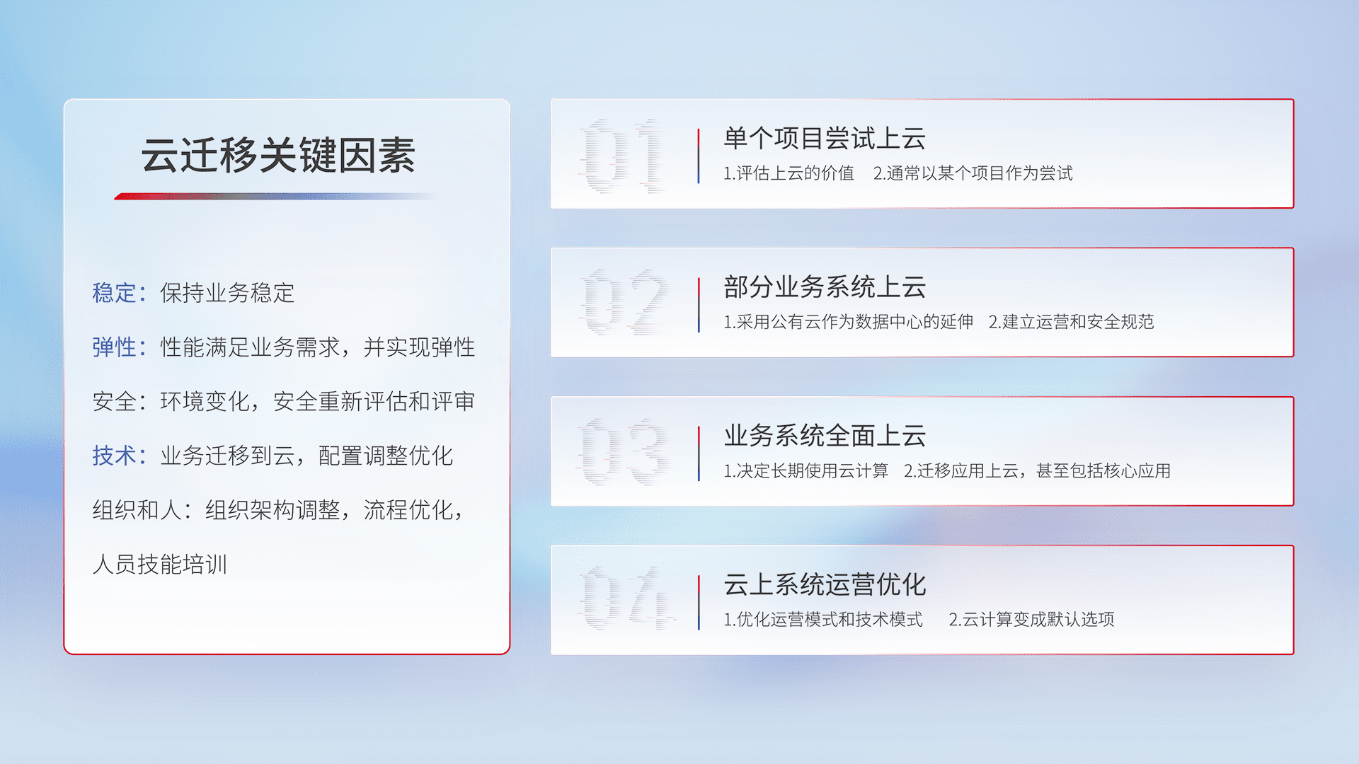 结合实际业务,,,从规划设计、、、、云平台选型、、云原生改造、、、、数据迁移、、集成交付,,迁移全过程为客户识别最佳上云路径,,做好风险识别管理,,,,设计网络架构、、、身份权限、、、、安全审计合规、、、操作审计、、日志审计、、、、监控告警策略、、、、多站点容灾设计等,,对云上基础设施进行整体规划,,,提升IT治理水平,,以满足弹性、、、高可用、、、高性能的需求。。。。